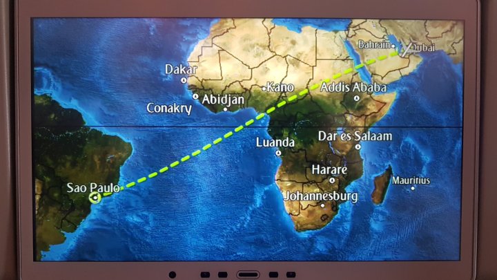 Jako ciekawostkę też powiem, że zaraz po starcie wszystkie rolety w oknach automatycznie się zamknęły i całą drogę lecieliśmy w zaciemnieniu. Słusznie bo za oknem nic ciekawego, najpierw afryka a potem ocean, łatwiej było się przespać a i na monitory słońce nie świeciło. Lot był cały czas w dzień, goniliśmy słońce☀️.