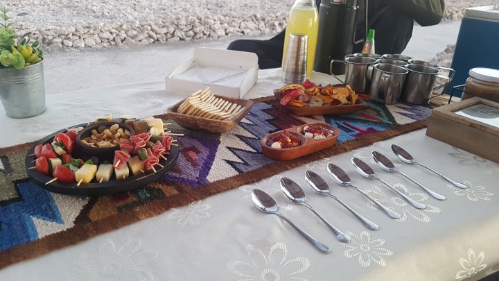 Jedziemy dalej. Czas na lunch, no i tutaj bomba😊. Kierowca zatrzymuje się w skalistym, osłoniętym dołku i wyciąga z bagażnika wszystko co niezbędne. Szok absolutny, jest tuńczyk, wino, przystawki. Wszystko elegancko podane, na obrusie i z prawdziwą zastawą!