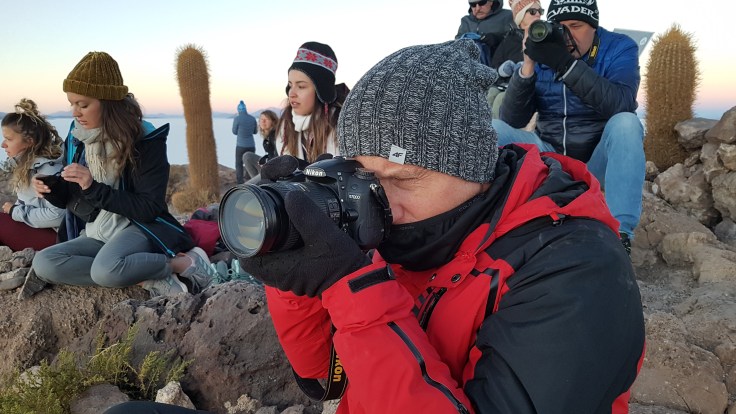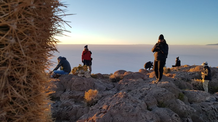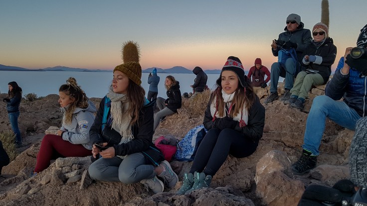 Na górze jest płaski taras ale zbocza są niezbyt strome i można legalnie łazić po całej okolicy. Jest tam nas kilkadziesiąt osób, wszyscy czekają wpatrzeni w horyzont po wschodniej stronie. Statywy, aparaty, kamery wycelowane w miejsce gdzie za chwilę rozpocznie się dzień.