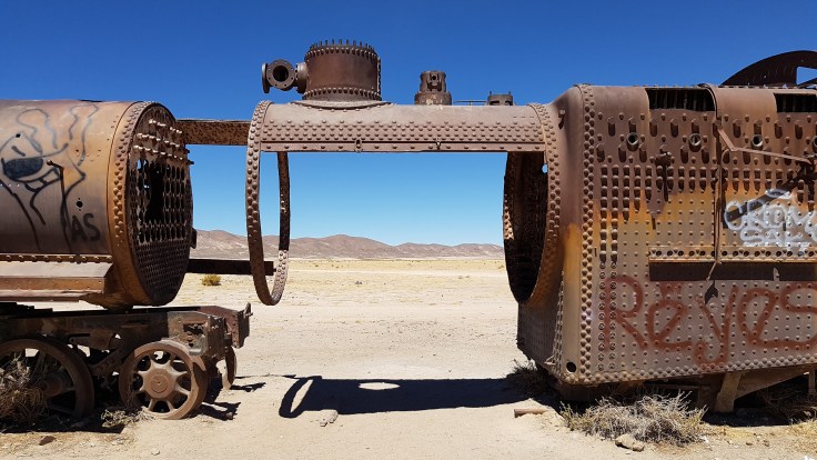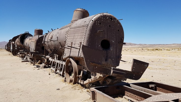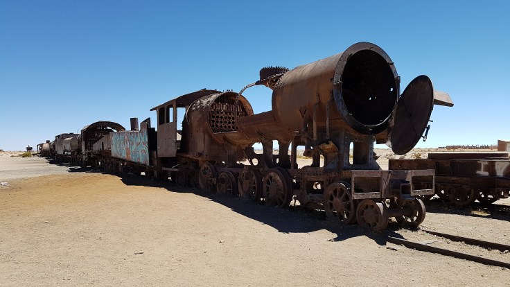 Dziwne miejsce. Jego historia sięga XIX wieku kiedy Boliwia miała dostęp do morza oraz zasoby cennych surowców kopalnych wysoko w górach. Aby móc urobek z kopalni skutecznie transportować do portu na wybrzeżu Boliwijczycy zlecili Brytyjskim inżynierom wybudowanie linii kolejowej. Niestety w 1890r. Boliwia straciła dostęp do morza na rzecz Chile i linia kolejowa zaczęła popadać w ruinę. Ostatnie pociągi stanęły uwięzione dopiero w 1940r. właśnie w tym miejscu. I tak tkwią do dnia dzisiejszego stanowiąc lokalną atrakcję turystyczną.