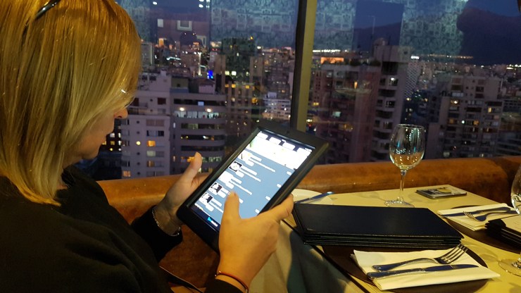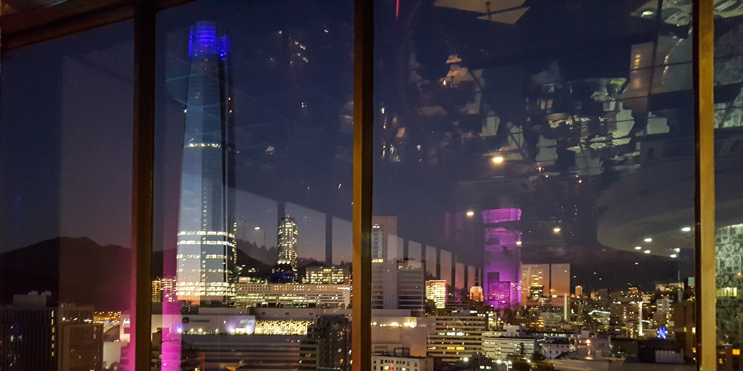 Szybki marsz, winda, szatnia, kelner, krzesło i już możemy siedząc przy stoliku stojącym na obrotowej platformie podziwiać panoramę miasta. Obraca się toto tak powoli, że zawrotu głowy nie dostaniemy w ogóle ruchu nie czuć. Dopiero po kilku minutach zauważyłem, że „Gran Torre Santiago” przesunął się wyraźnie w prawo.